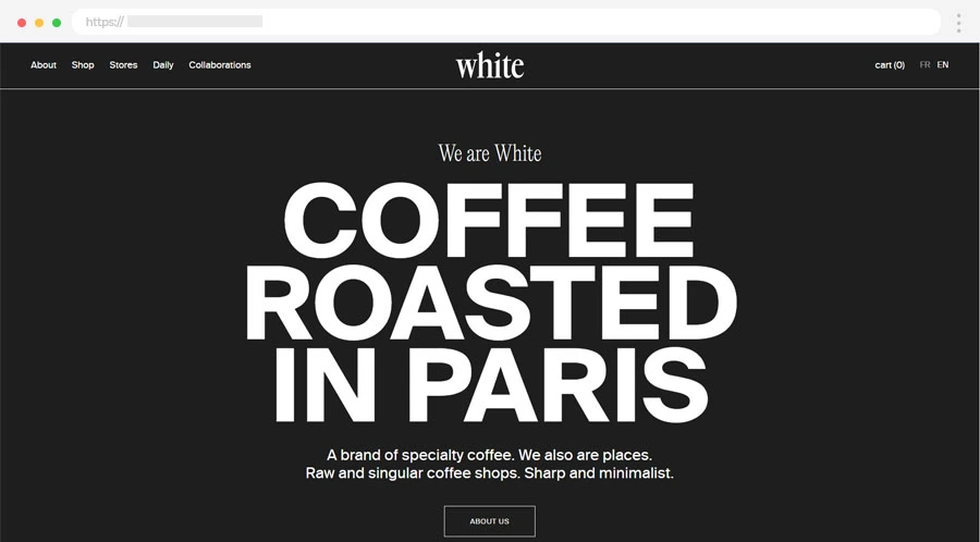 La palette in bianco e nero del sito crea un contrasto marcato con i prodotti colorati.