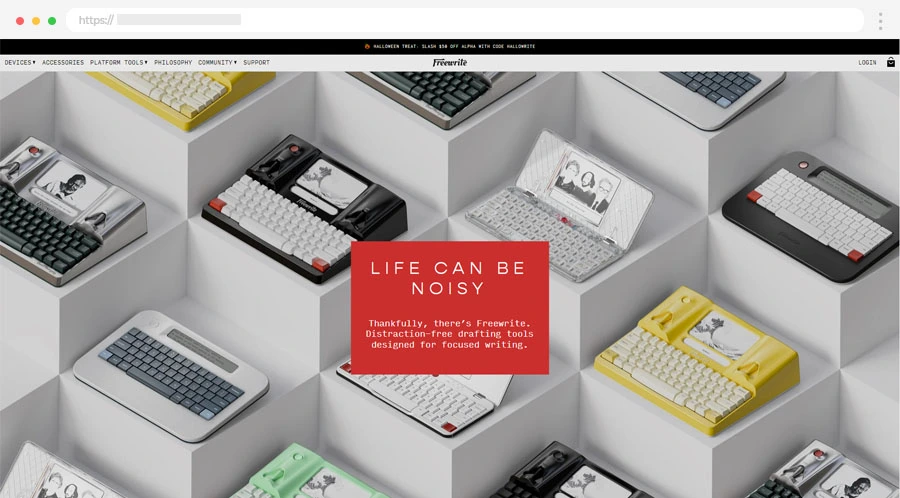 Il sito utilizza ampie aree di spazio bianco, creando un aspetto pulito e ordinato. In questo modo, i prodotti risaltano, con immagini di alta qualità che occupano il centro della scena.