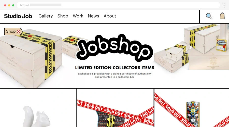 Il sito web di Studio Job presenta un design audace, eclettico e artistico che riflette perfettamente lo stile avanguardista dello studio. La tipografia originale, i layout dinamici e le immagini di grandi dimensioni dei loro prodotti e opere d'arte creano un impatto visivo forte.