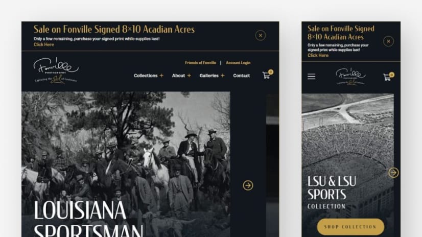 Fonville Winans Photography è un sito eCommerce che espone e vende stampe delle opere più famose dell'artista. Il design del sito complementa perfettamente le fotografie senza sopraffarle. Il sito presenta un design pulito con un elegante schema di colori nero e oro e una tipografia bianca, creando un'atmosfera sofisticata ed elegante. La modalità scura del sito esalta i visual e fa risaltare le opere d'arte.
