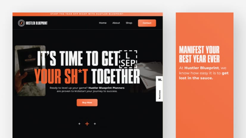 Il sito web di Hustler Blueprint Planners è il punto di riferimento per strumenti di produttività come agende e planner. Il design è moderno e accattivante, con elementi fluttuanti e un audace schema di colori nero, bianco e arancione.