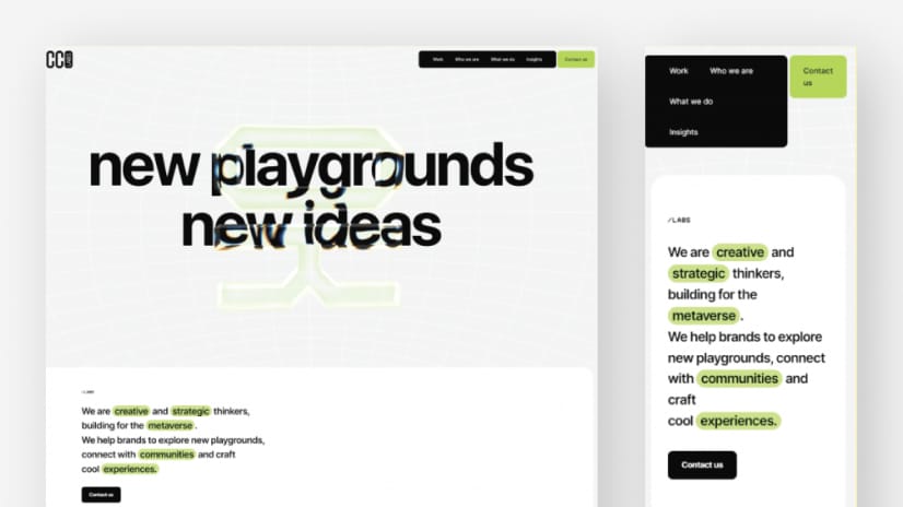 Utilizzano una tipografia grande e audace con un layout a griglia modulare, aggiungendo tocchi divertenti come animazioni al passaggio del mouse e un'icona del menu personalizzata con un elegante effetto di transizione nella navigazione.