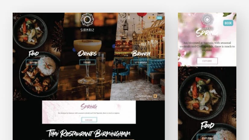 Siamais è un vivace bar e ristorante di cocktail a Birmingham, e il suo sito web riflette perfettamente l'atmosfera dinamica del locale. Il sito presenta grafiche audaci e colorate che catturano l'energia del posto. Una caratteristica distintiva è lo schermo triplo diviso, con video di sfondo che si attivano al passaggio del mouse nella sezione principale, offrendo agli utenti tre diverse opzioni per esplorare il sito.