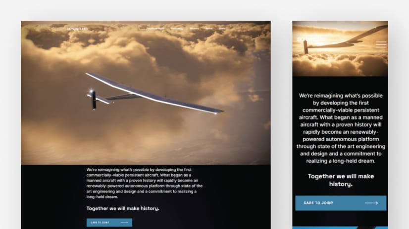 Skydweller è un'azienda che sta rivoluzionando l'industria aeronautica sviluppando il primo aeromobile commerciale persistente. Il loro sito web è un eccellente esempio di design moderno, con un video di sfondo nitido e fluido nella sezione principale che mostra un modello 3D animato dell'aeromobile.