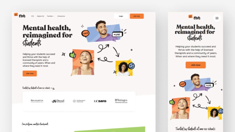 Passiamo a To Be Honest, una piattaforma di supporto per la salute mentale pensata per la Gen Z, che rompe gli schemi con un design del sito innovativo. Una delle caratteristiche distintive del loro sito è il design pulito, che crea un'atmosfera calma e accogliente per chi cerca supporto.