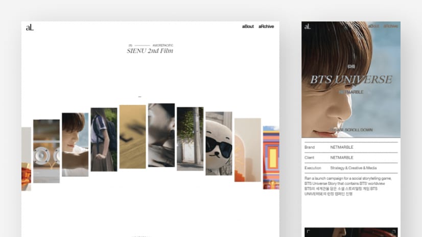aL è un'agenzia di comunicazione integrata che propone un design del sito web tutt'altro che ordinario. Il loro sito a scorrimento orizzontale a tutto schermo offre un'interpretazione unica della navigazione, con tutti i contenuti organizzati in miniature scrollabili arricchite da eleganti animazioni al passaggio del mouse.